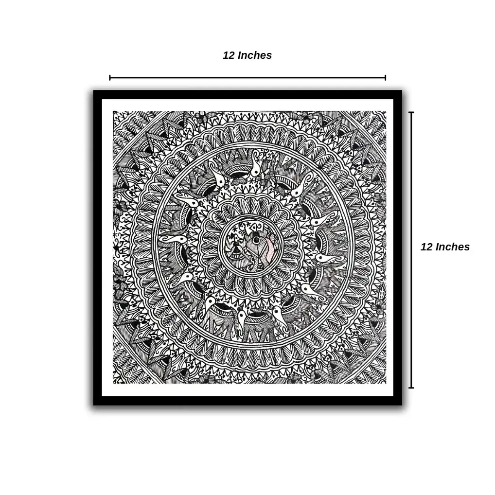 This stunning Madhubani mandala artwork highlights the beauty of Bihar’s Mithila painting tradition through intricate black-and-white patterns. At the core, elephants are beautifully depicted, representing power, dignity, wisdom, and good fortune. The circular mandala design signifies harmony and balance, while the fine linework reflects the unmatched skill of traditional Madhubani artists. Ideal for wall décor, gifting, cultural collections, or exhibitions, this handcrafted piece is a timeless representation of India’s folk heritage.