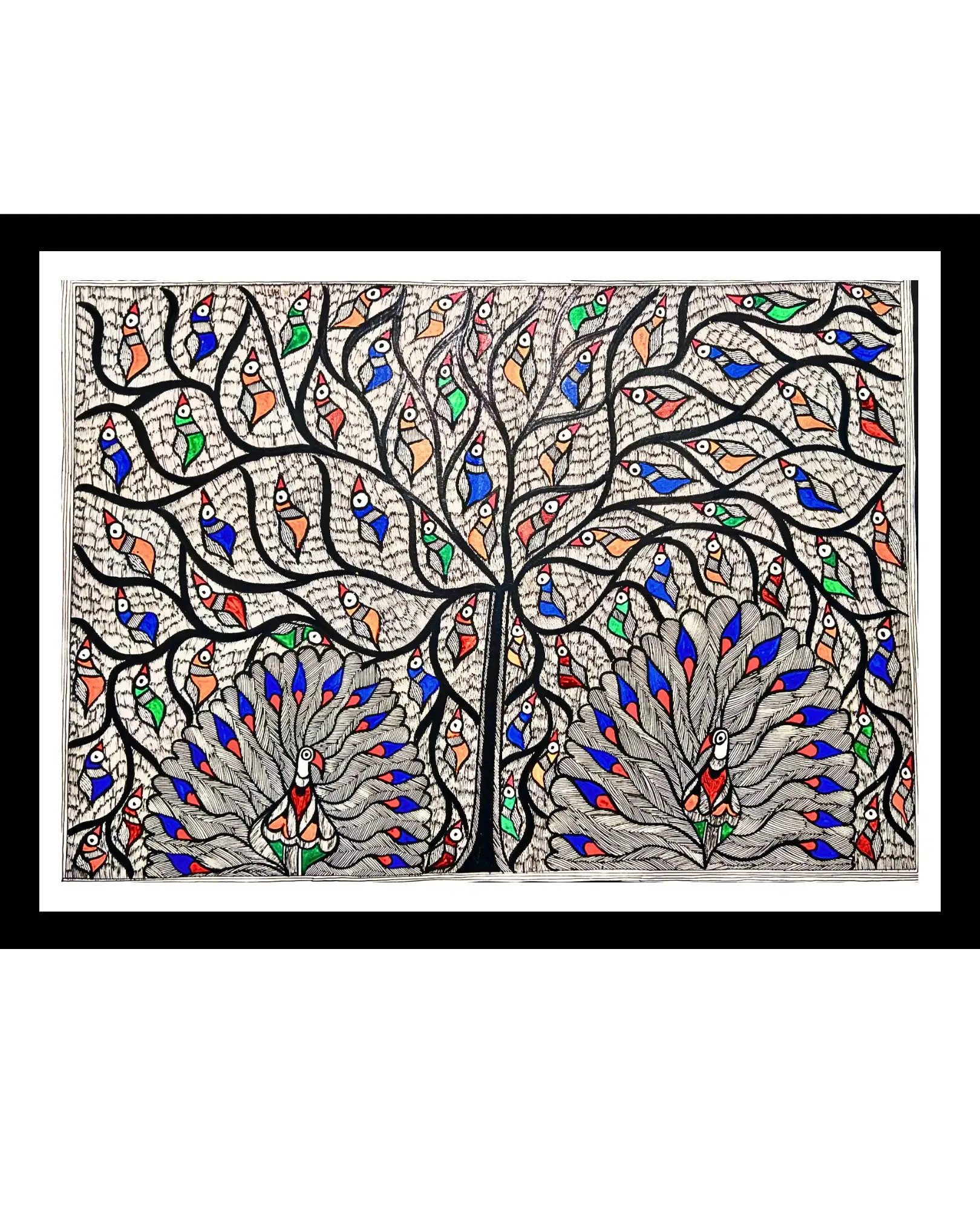 This Peacock Couple, Birds & Tree Handmade Madhubani Painting captures the essence of Indian folk traditions through vibrant detailing and symbolic storytelling.