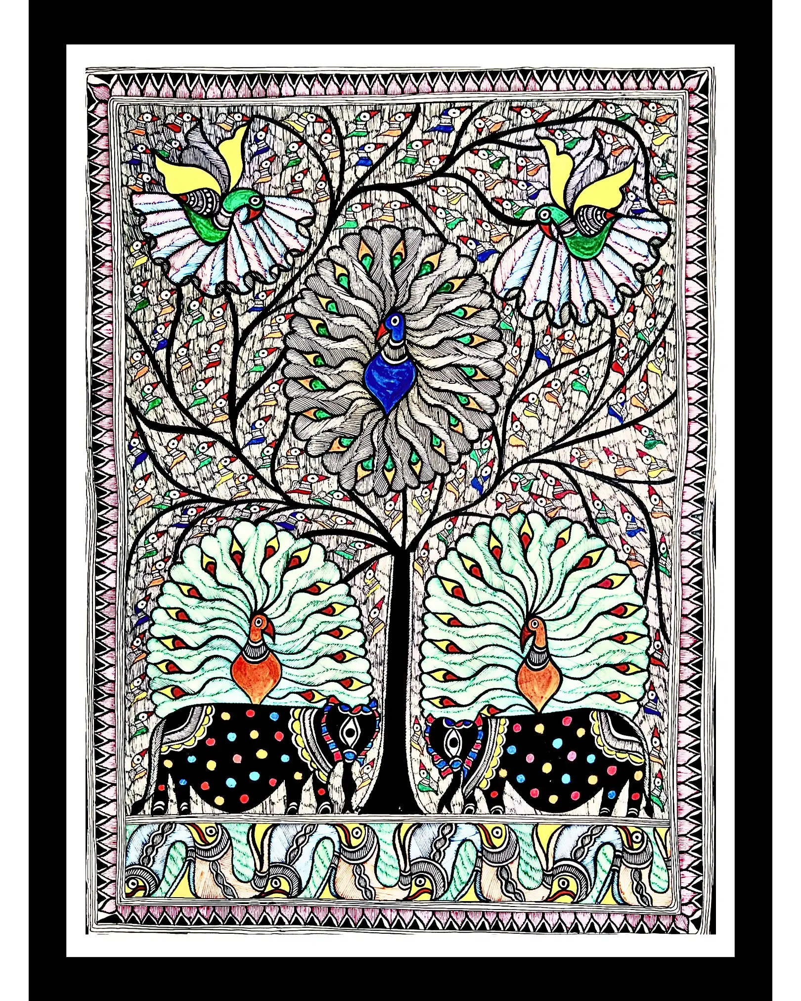 This Peacock, Tree, Elephant & Fish Handmade Madhubani Painting beautifully combines four symbolic elements of Mithila folk art: