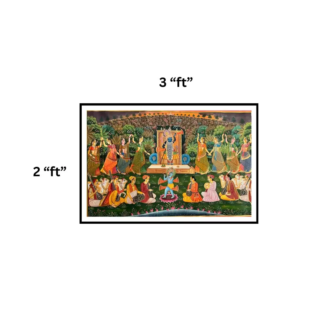 ' A traditional art form practiced in Nathdwara, Rajasthan, the Pichwai is an intricate painting that depicts theatrical scenes from Lord Krishna's life, typically hung behind the sanctum of his own manifestation, Shrinathji. Pichwai paintings are works of art that are used to adorn the walls of temples, behind the idol'
