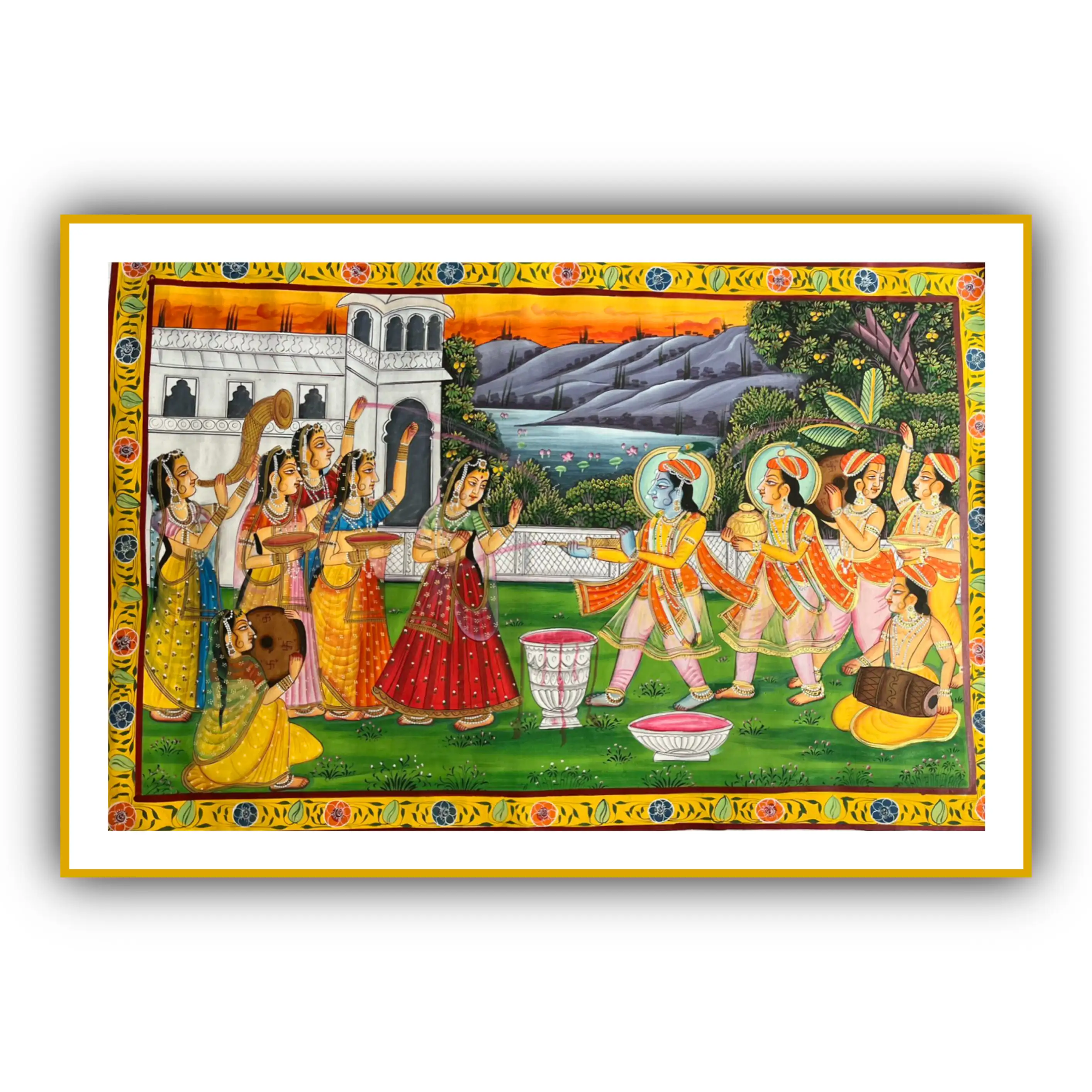 Authentic Pichwai Art – Traditional painting style depicting Lord Krishna playing Holi, with intricate detailing and vibrant colors.