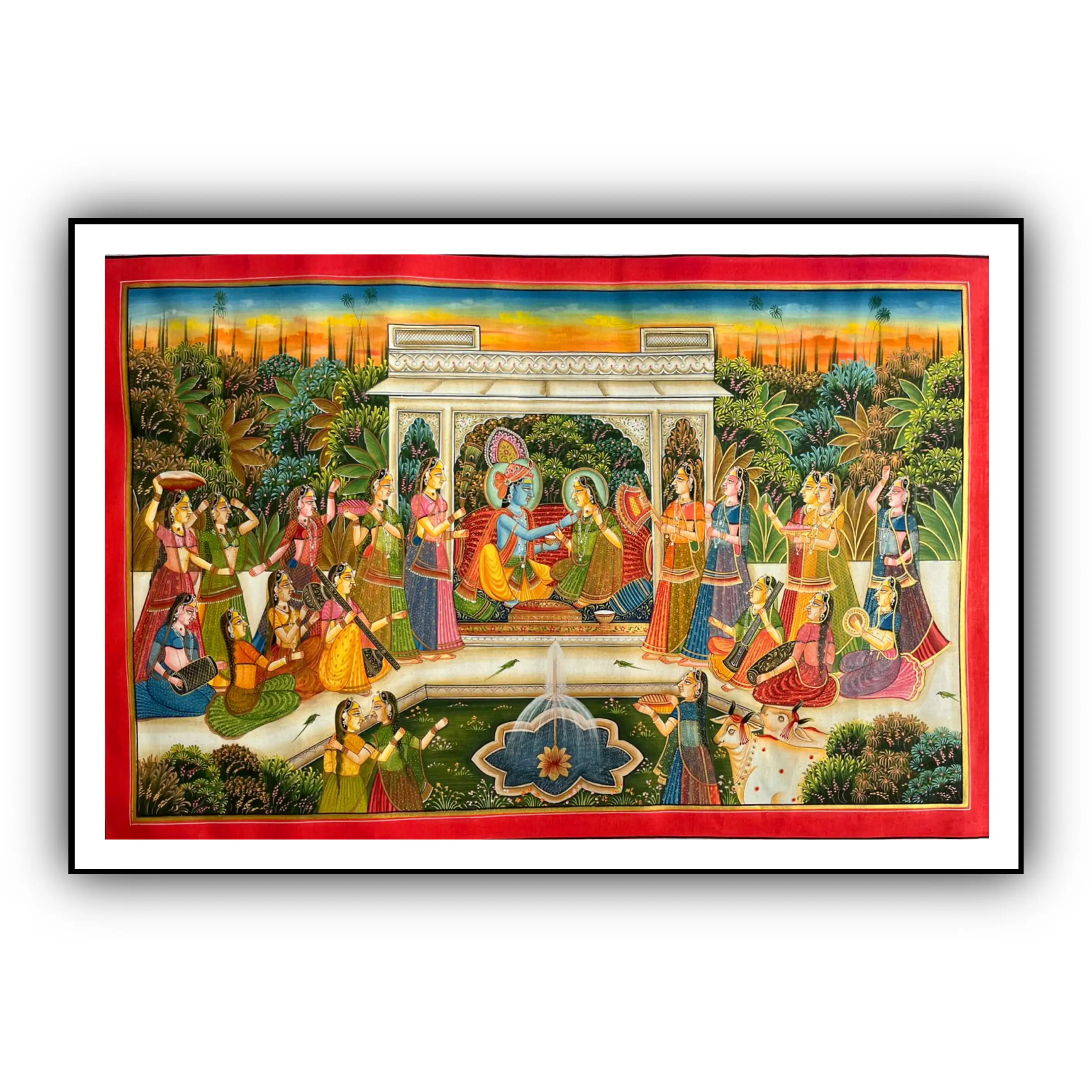 This beautiful handmade Pichwai painting portrays Radha and Krishna seated gracefully in an ornate pavilion, surrounded by Gopis playing musical instruments and offering flowers in devotion. The lush garden backdrop, cows, parrots, and central lotus fountain enhance the charm and divinity of the scene. Created with fine brushwork and rich colors, this artwork reflects the elegance of traditional Pichwai artistry. Delivered unframed, it offers flexibility to match your personal décor style. Ideal for living rooms, pooja rooms, cultural spaces, or as a meaningful gift, this painting is a timeless celebration of love and devotion.