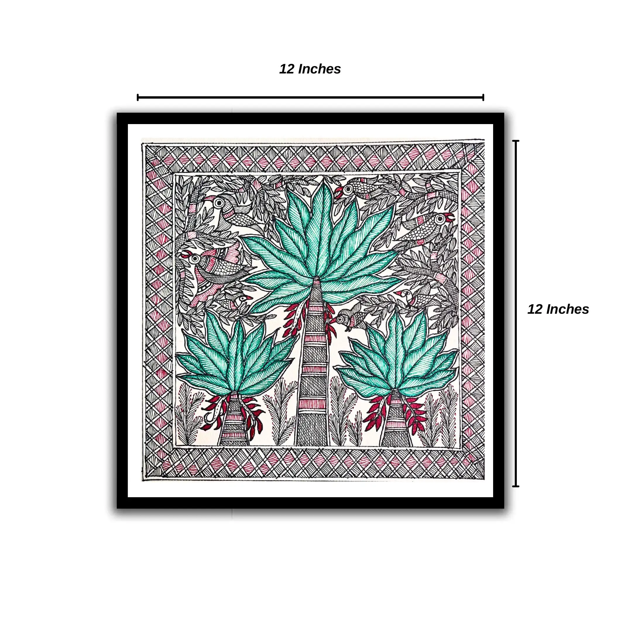 This handmade Madhubani Banana Tree Painting beautifully portrays banana trees with vibrant birds, reflecting the traditional themes of fertility, prosperity, and nature’s abundance. Created with fine detailing and folk patterns, this painting showcases the essence of Mithila art. Perfect for home décor, offices, gifting, or art collections, this artwork adds a cultural touch and brings positivity to your living space.