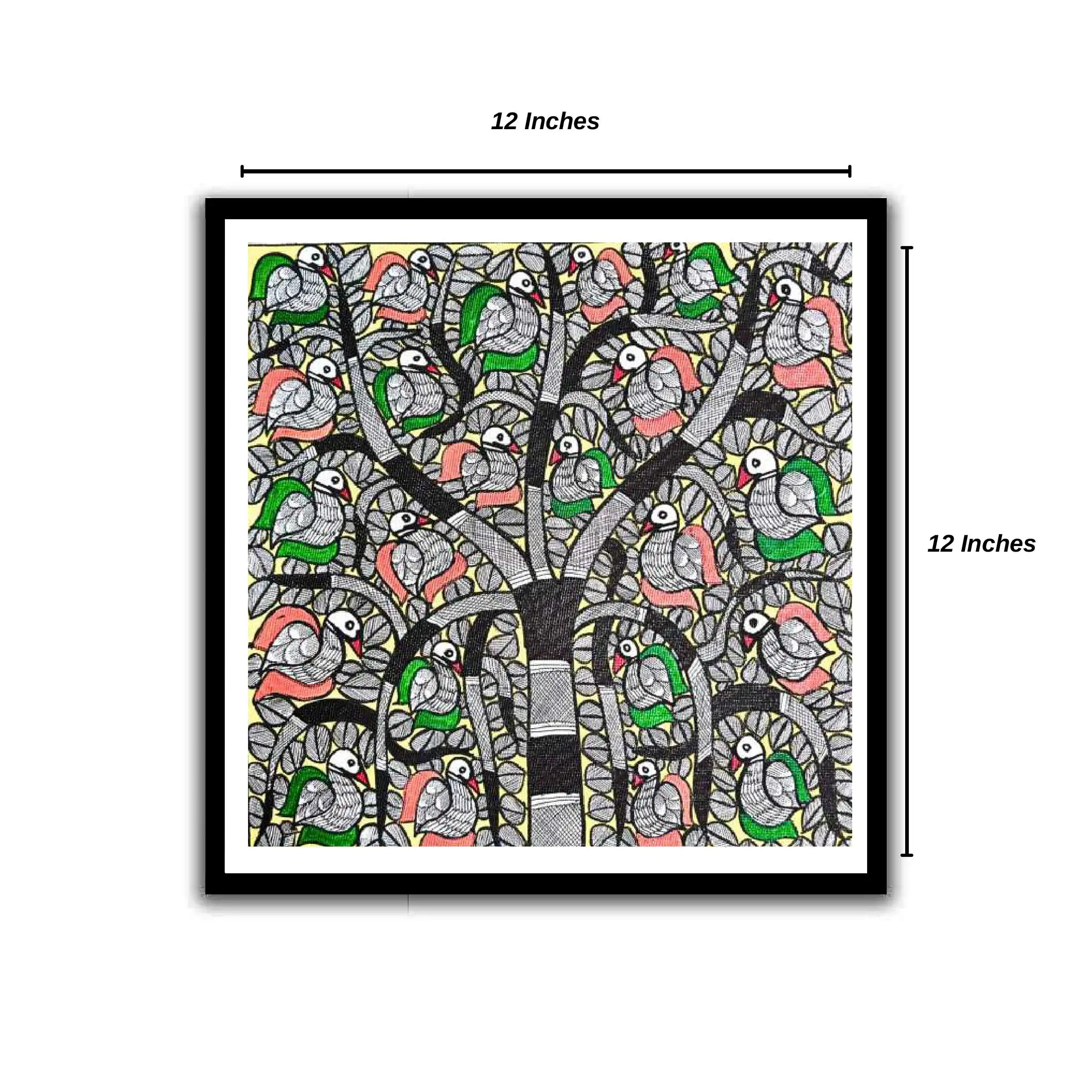 This authentic handmade Madhubani painting depicts the Tree of Life adorned with vibrant birds, symbolizing joy, prosperity, and the connection between life and nature. Each bird is intricately painted with fine detailing in traditional Mithila style, using natural colors and patterns.