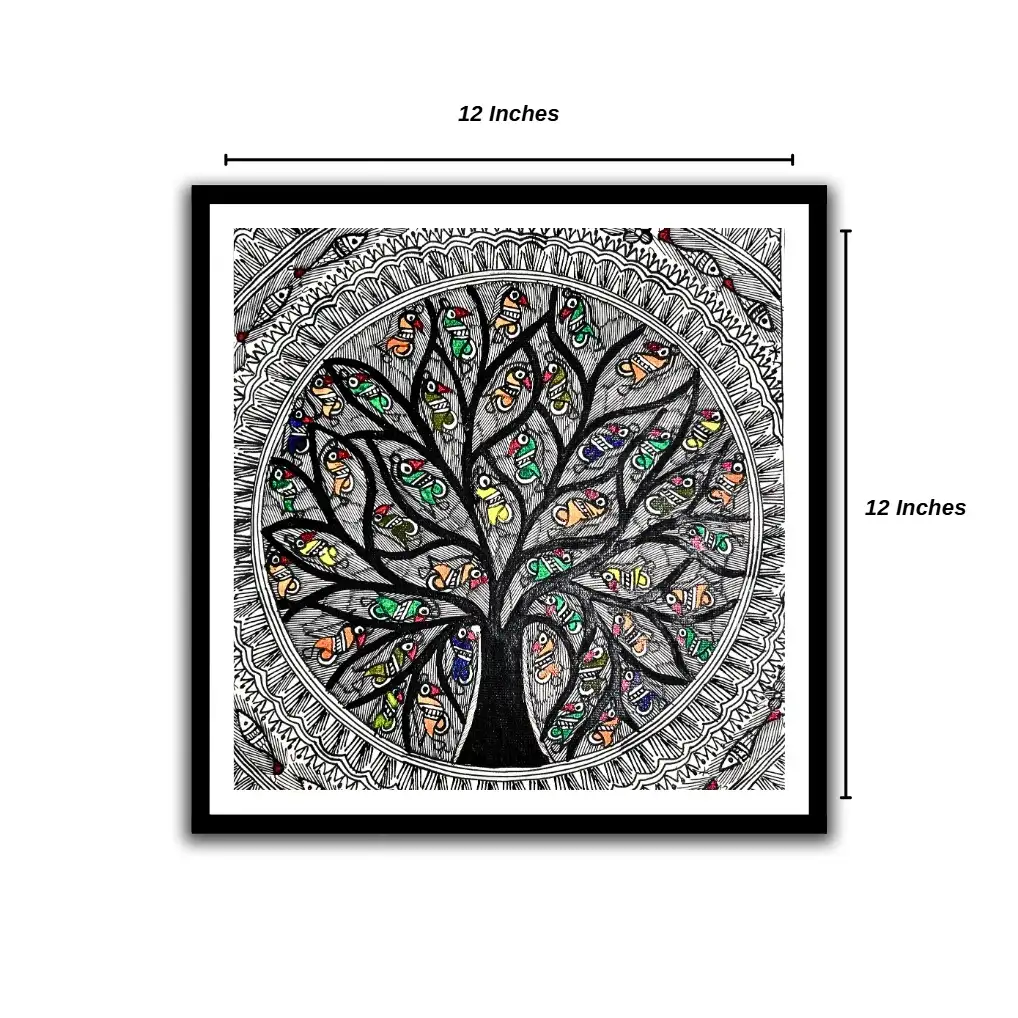 This captivating Madhubani Tree of Life painting beautifully blends two powerful folk motifs – the sacred tree, symbolizing eternal growth and cosmic connection, and the fish, representing prosperity, fertility, and abundance. Crafted in intricate black linework with touches of vivid colors, this artwork embodies the essence of harmony between nature and life. Hand-painted in Bihar’s renowned Mithila folk tradition, it is an ideal piece for wall décor, cultural gifting, or spiritual spaces.