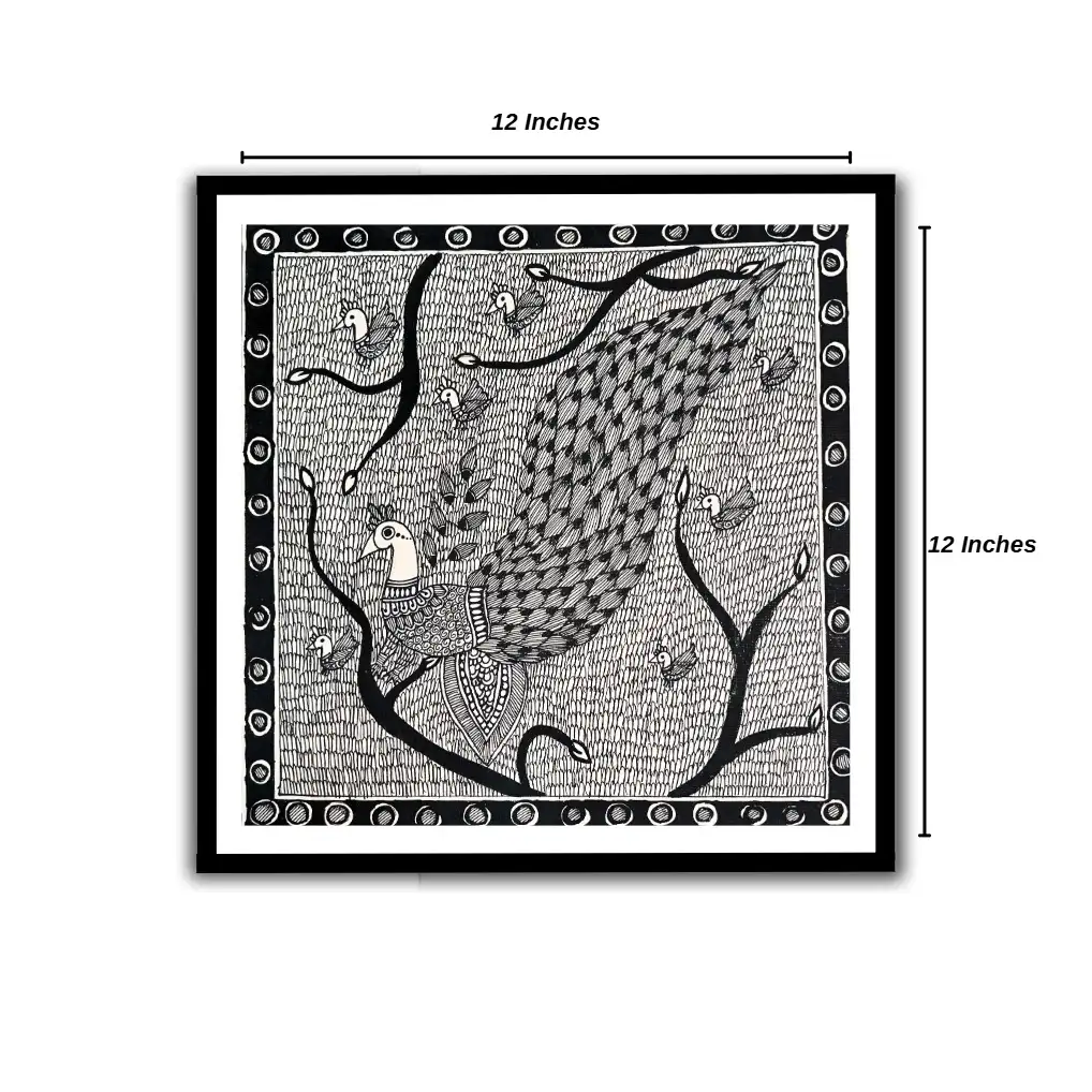 This elegant Madhubani painting portrays a majestic peacock perched on a tree, surrounded by smaller birds. In Indian tradition, the peacock represents love, grace, and divine beauty, while the tree symbolizes growth, strength, and the continuity of life. The artwork is entirely hand-drawn with intricate black-and-white linework, showcasing the traditional Mithila folk art style of Bihar. Ideal for wall décor, cultural gifting, or collectors of authentic Indian folk art, this piece beautifully captures the harmony between nature and spirituality.