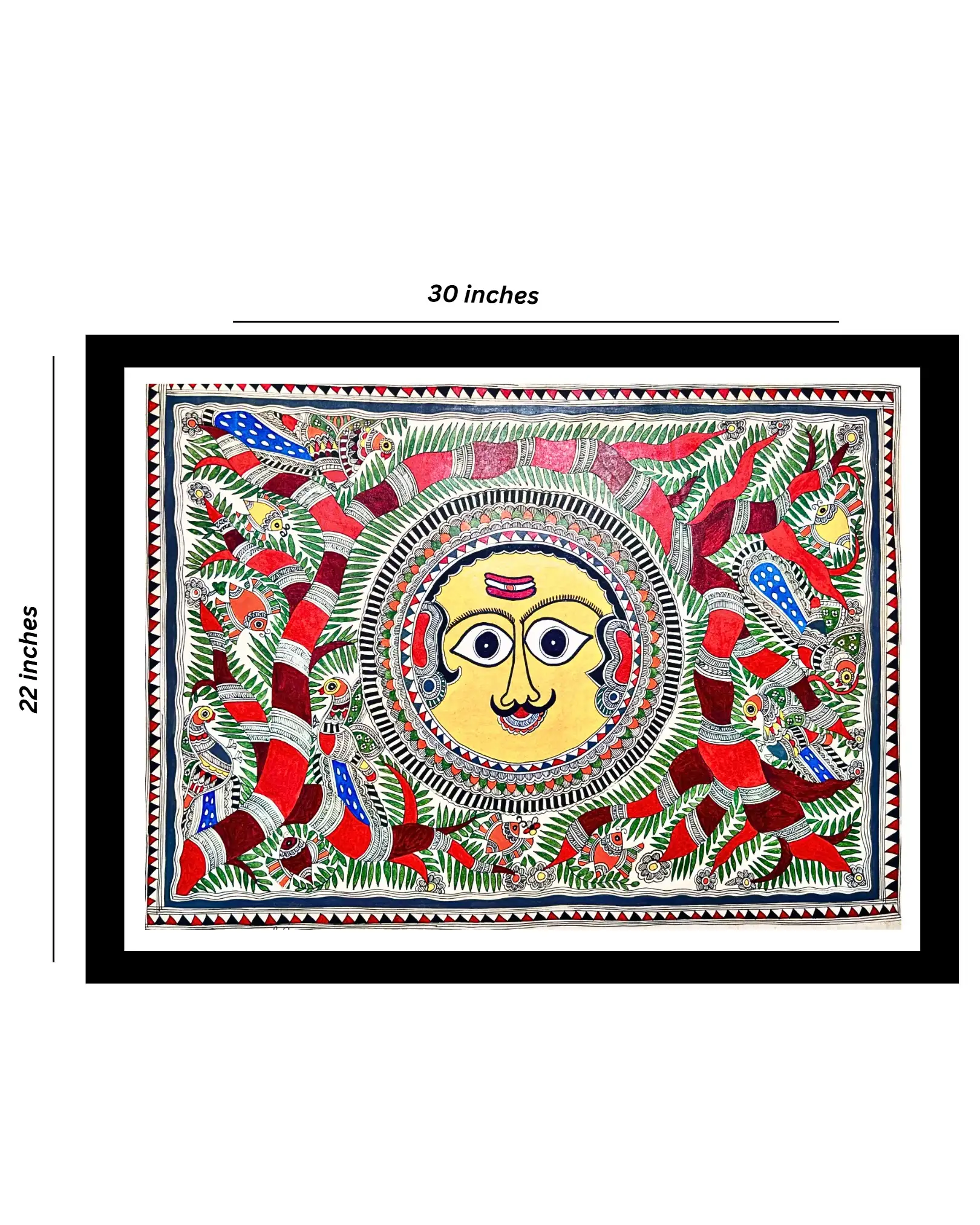 This Handmade Madhubani Sun Painting beautifully showcases the Sun God (Surya), a symbol of power, energy, and prosperity, surrounded by intricate foliage and birds. Painted meticulously by skilled artisans from Mithila, Bihar, this artwork is created using natural colors and traditional methods. A stunning piece of Indian heritage, ideal for adding warmth and culture to your home, office, or art collection.