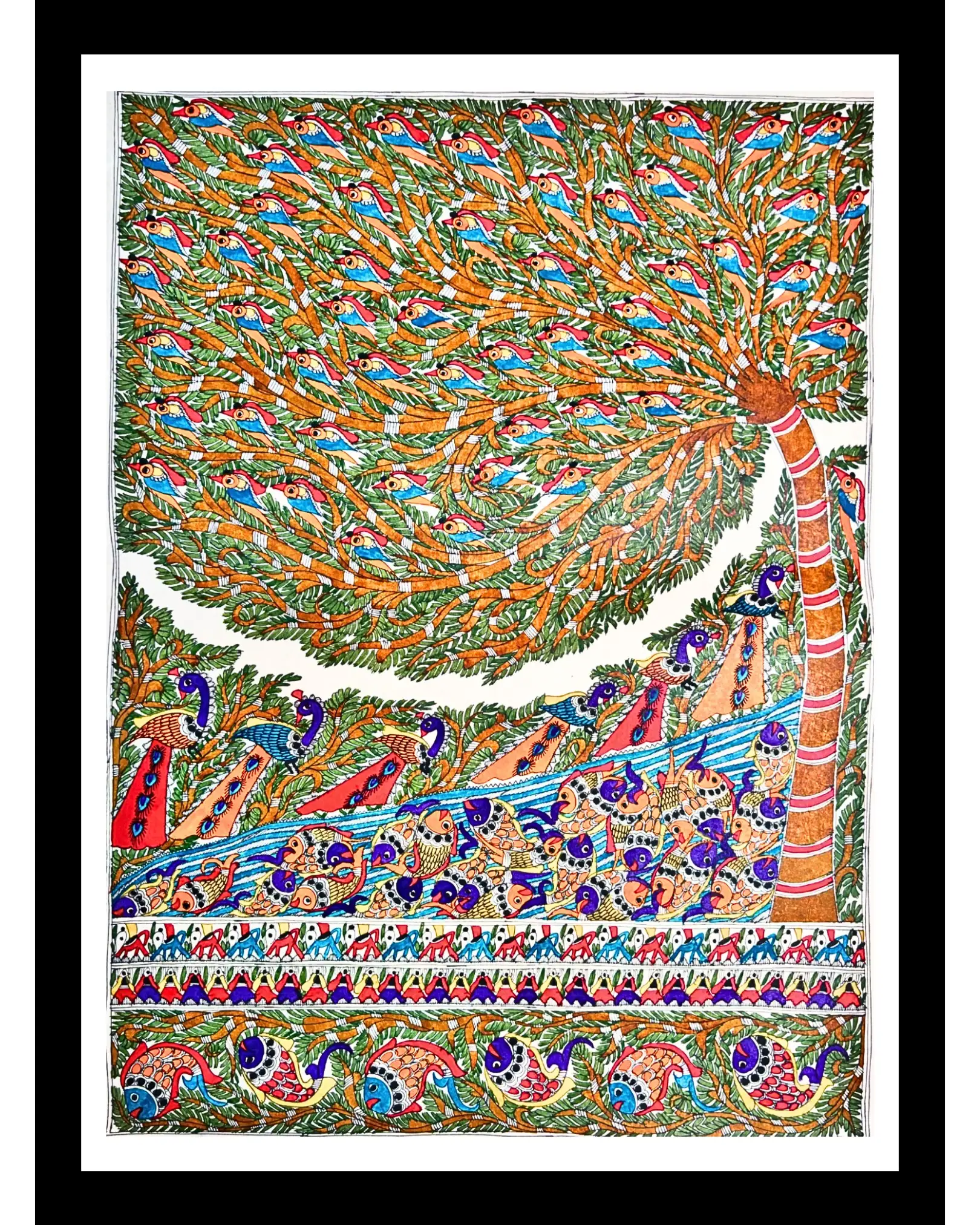 This Peacocks, Fish & Tree Handmade Madhubani Painting is a fine example of India’s Mithila folk art, known for intricate linework and symbolic storytelling.