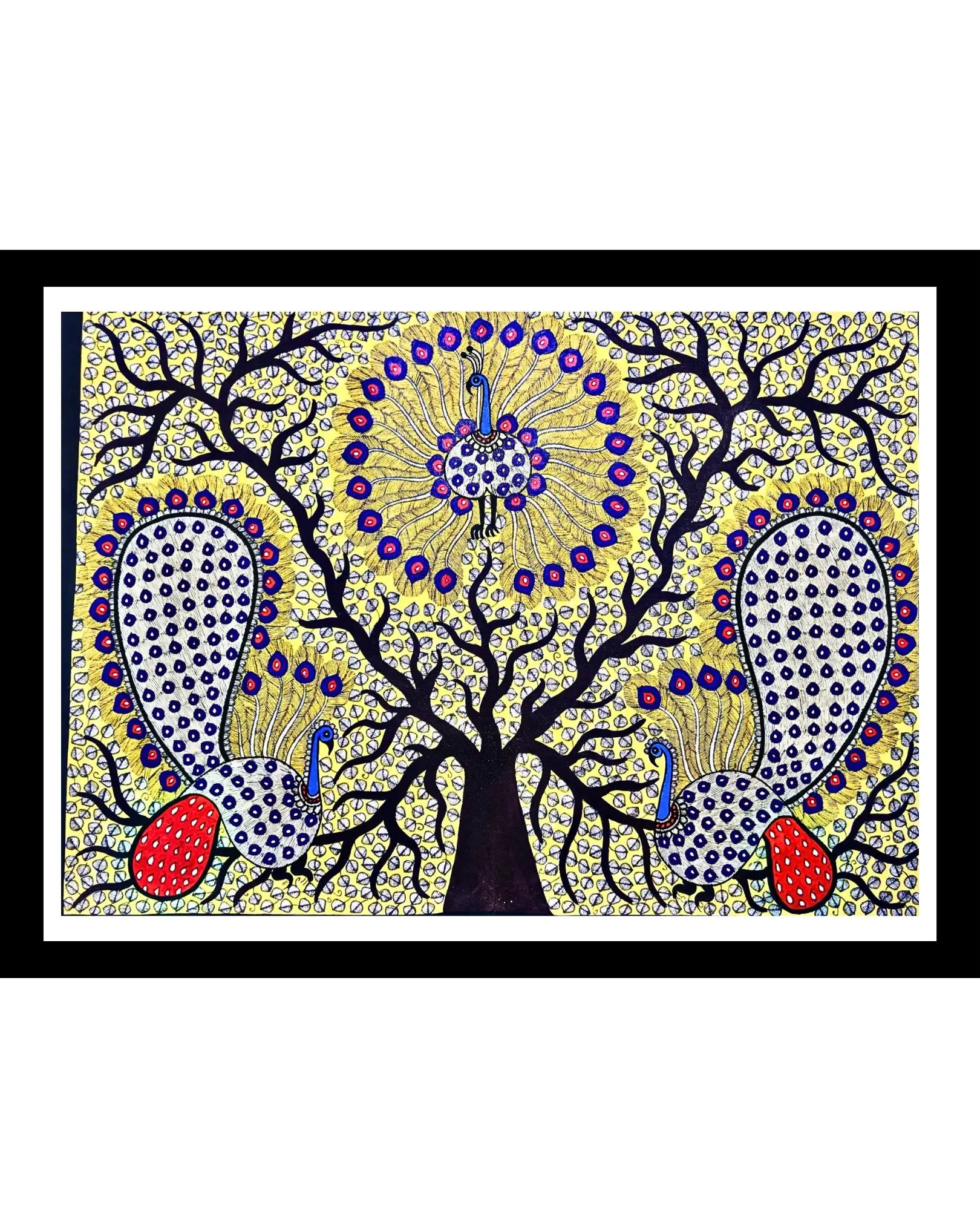 This Peacock Family on Tree Handmade Madhubani Painting captures the elegance of peacocks and the symbolism of a flourishing tree. In Madhubani art, peacocks represent beauty, love, and joy, while the tree symbolizes growth and balance. Hand-painted by skilled Mithila artisans from Bihar, this artwork is created using eco-friendly natural pigments and traditional techniques, making it a meaningful addition to any home or office décor and a thoughtful gift for festivals or celebrations.