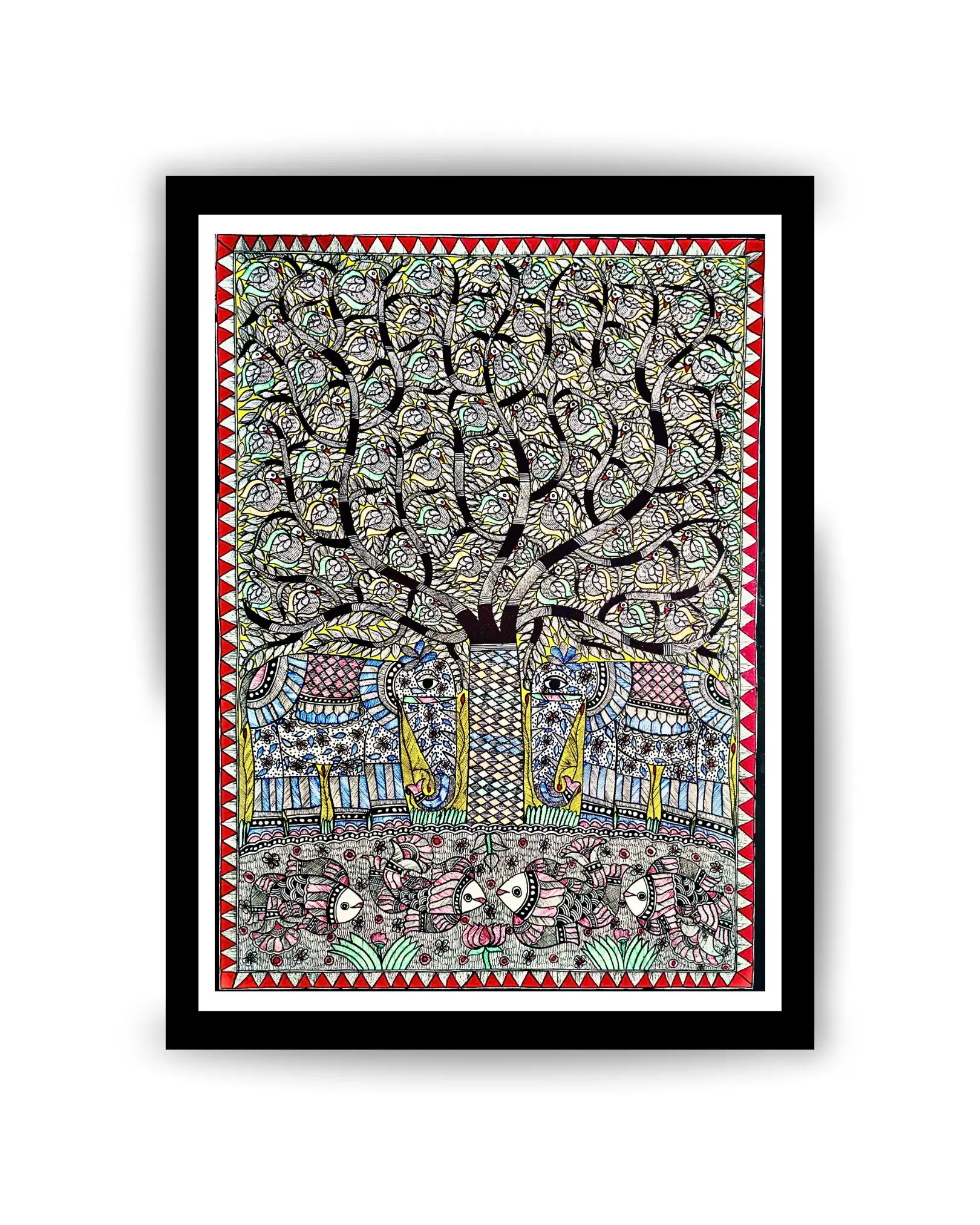 This Elephant, Fish & Tree Handmade Madhubani Painting is a vibrant piece of traditional Mithila art crafted by skilled artisans from Bihar, India.