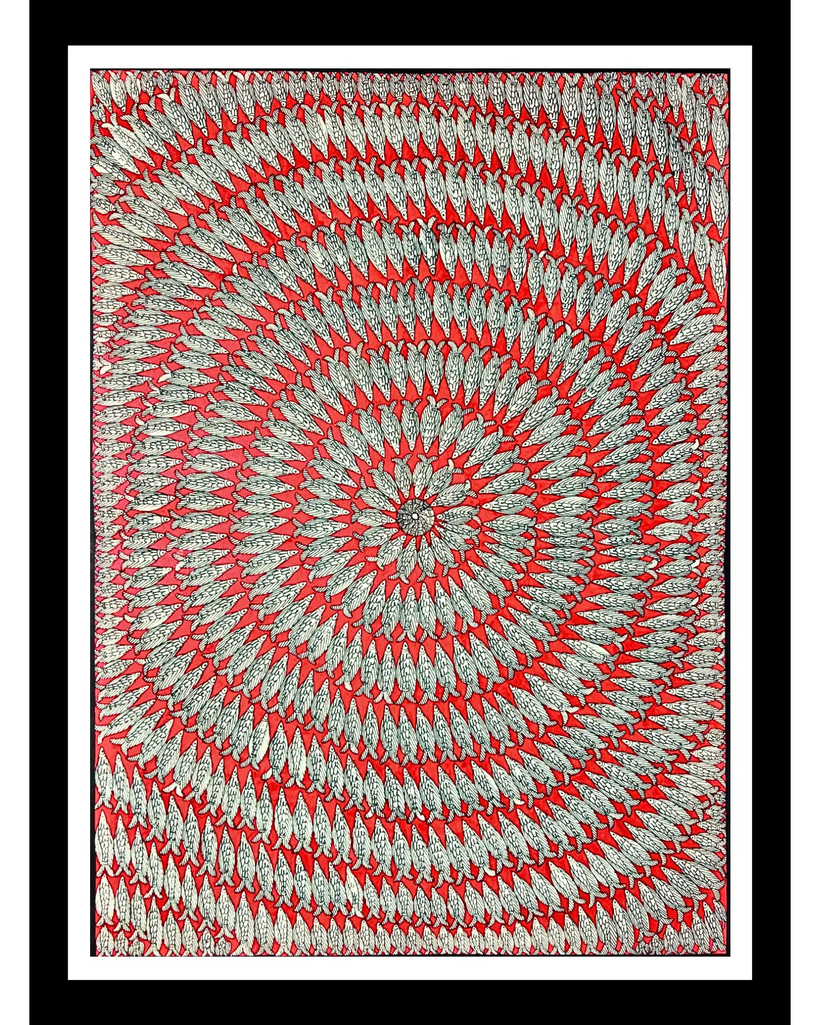 This stunning Red Fish Mandala Madhubani Handmade Painting is a masterpiece from the traditional folk art of Mithila, Bihar. The fish motif in Madhubani art represents prosperity, fertility, and good luck, while the mandala design symbolizes balance and harmony. Each detail is carefully hand-painted using natural colors on handmade paper, reflecting India’s timeless cultural heritage.