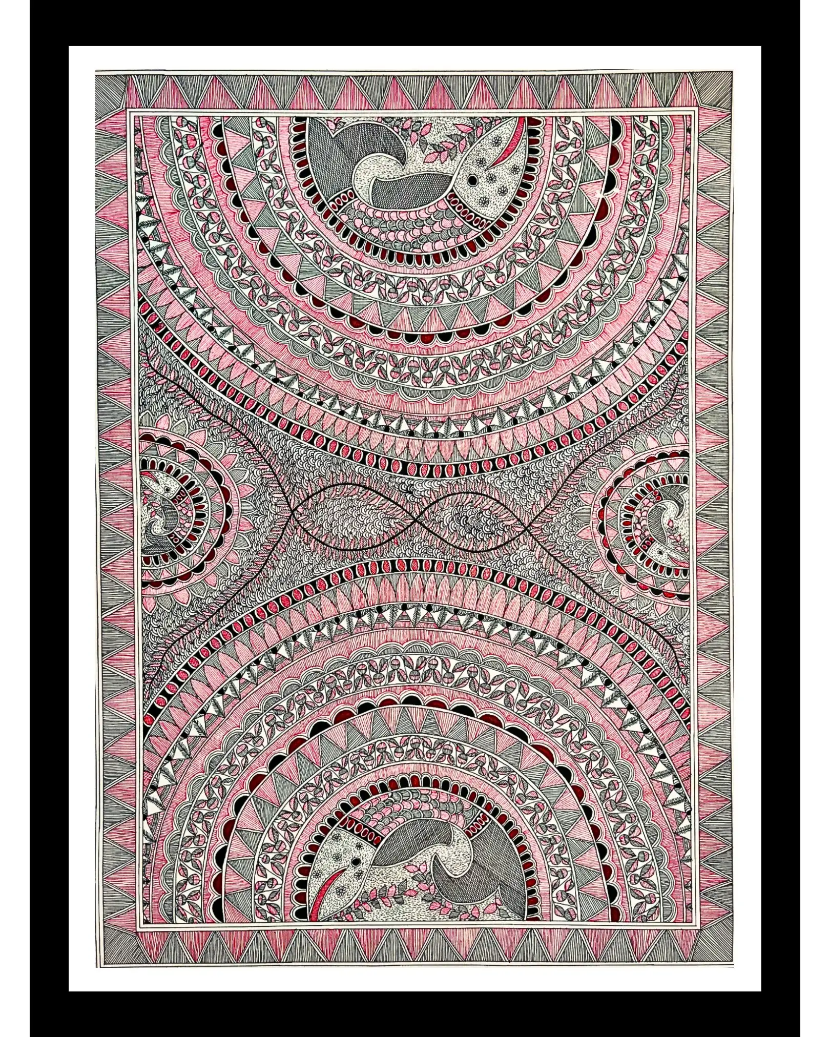 Hand-painted on handmade paper using natural colours, the artwork showcases the fine detailing and cultural richness that Madhubani art is known for. Its large size makes it an eye-catching décor piece for living rooms, offices, galleries, or art collections.
