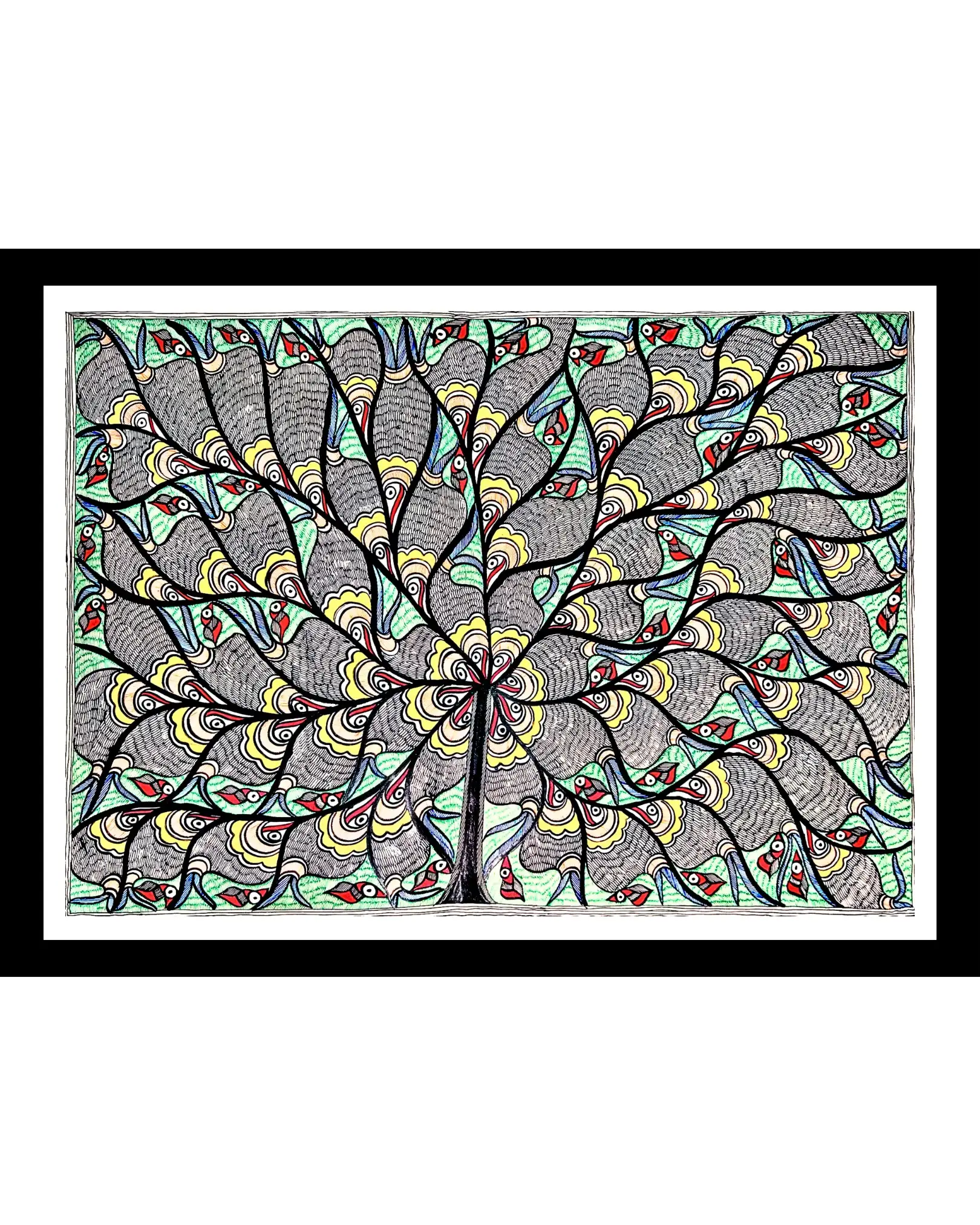 This Fishes & Birds Madhubani Handmade Painting (22x30 inches, unframed) is a vibrant artwork that reflects the deep symbolism of Mithila folk art.