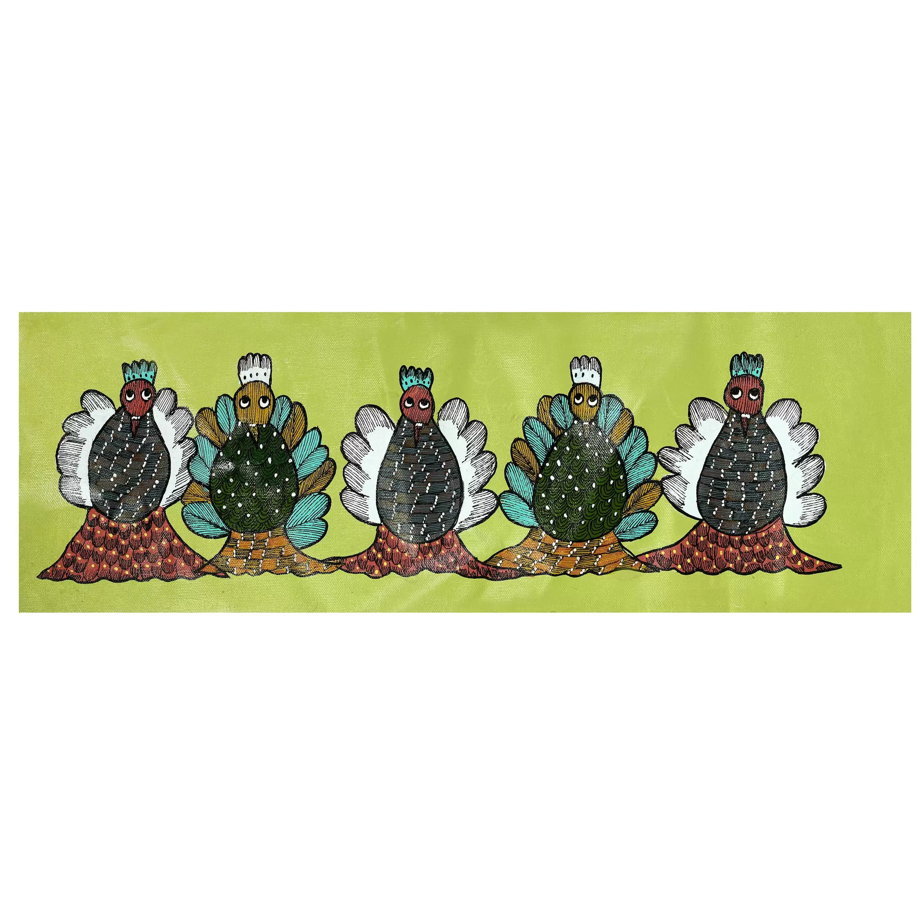 This Gond art painting features a beautiful design of five owls, handmade with intricate details and vibrant colors, perfect for adding a touch of cultural charm to any home or office wall. Made by skilled artisans, this painting showcases the beauty of Gond art, a traditional art form of the Gond tribe in India. The high-quality materials and beautiful design make it an ideal wall art decor for bedrooms, living rooms, and office spaces. The painting is sure to grab attention and become a conversation starter, as it's a great example of traditional Indian art. Add a touch of elegance and cultural significance to your environment with this beautiful piece.